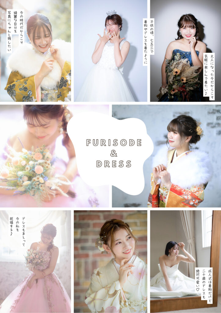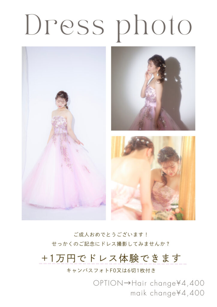 - 20歳の記念に振袖撮影をされる方に+1万円で叶うドレス体験♡是非ドレスでも撮影しませんか?