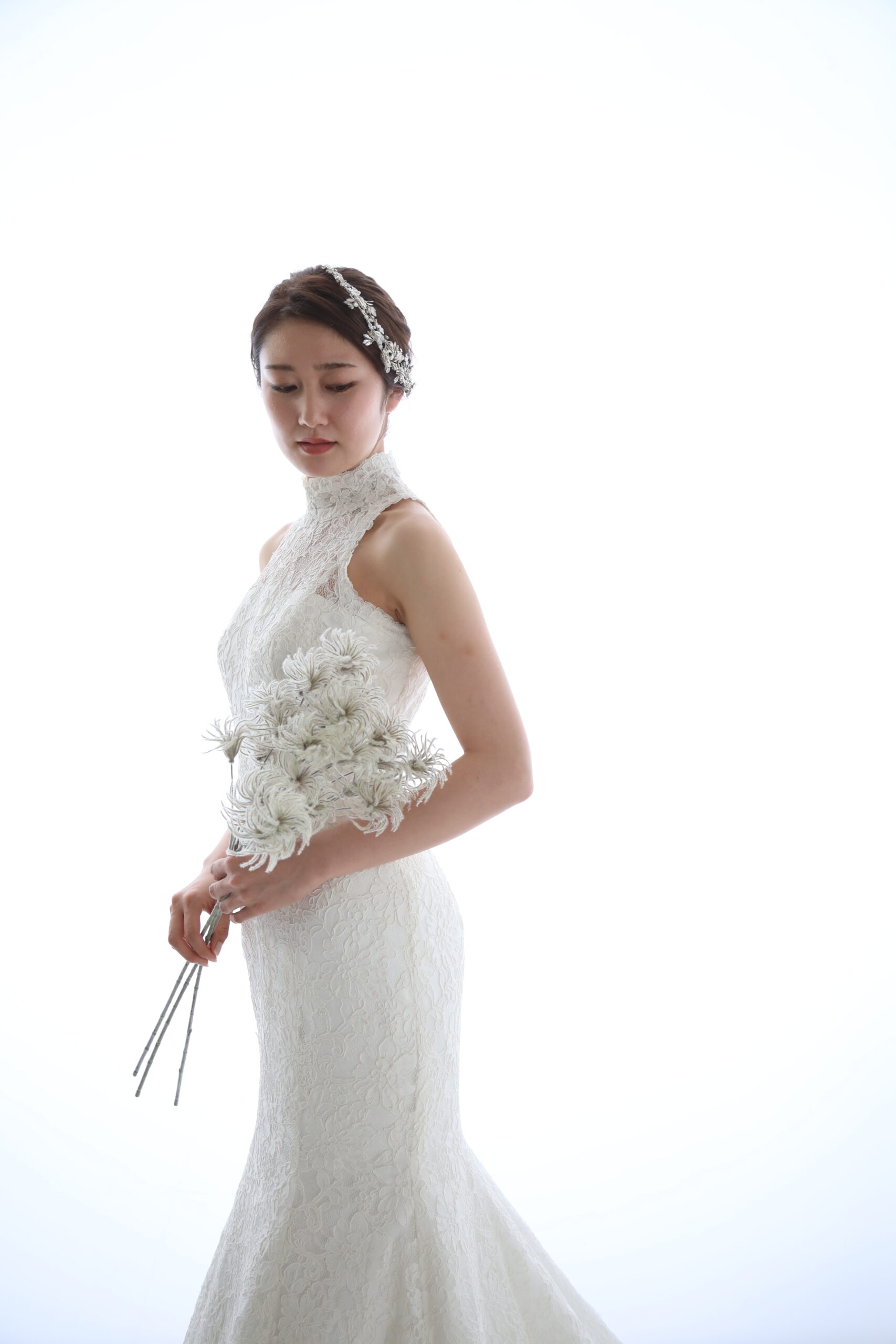 総レースのマーメイドラインドレス。ハイネックのデザインでエレガントな印象に。身体のラインが美しく映える衣装です。