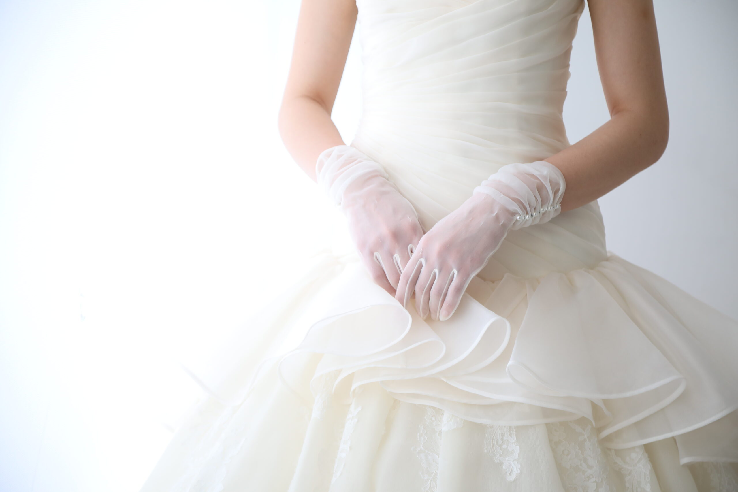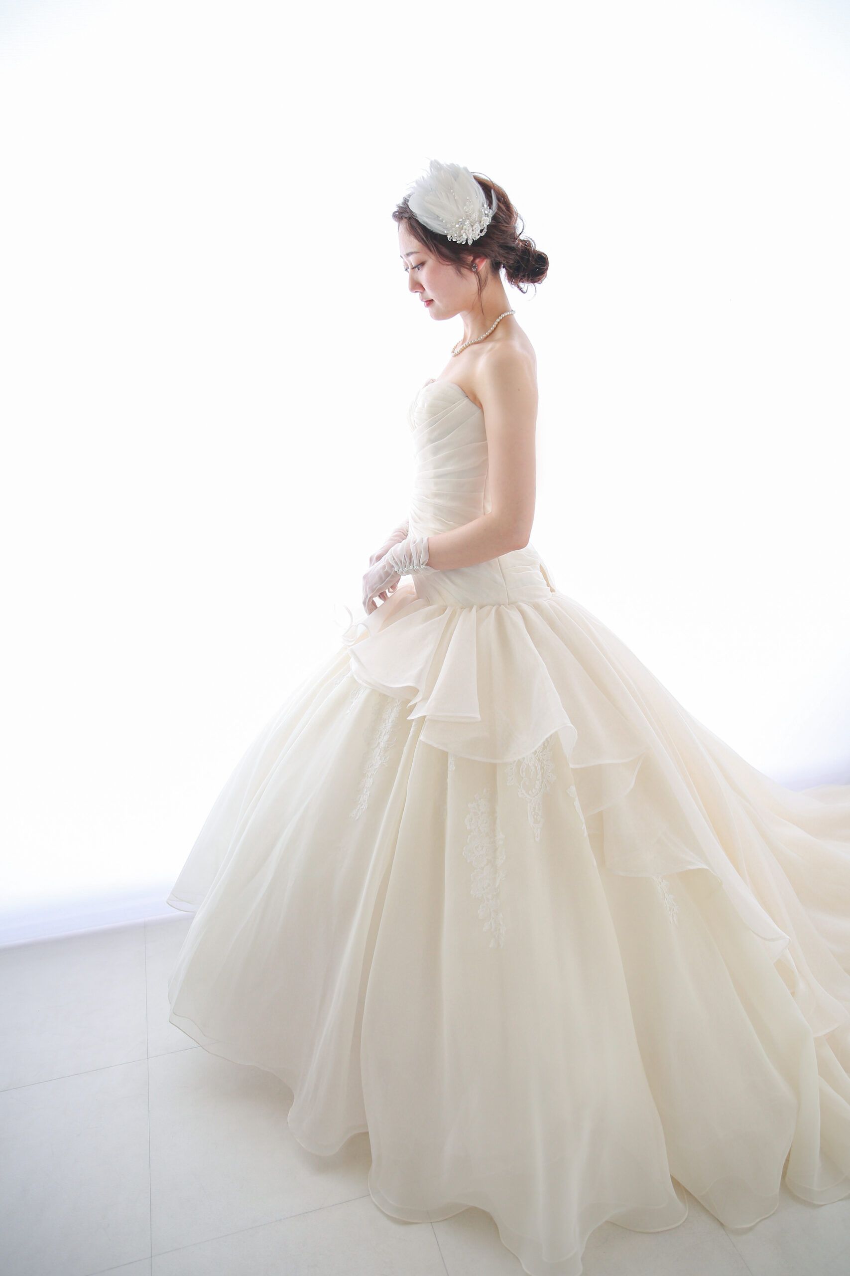 シフォン生地のオフホワイトドレス。ローウェストでウェストラインを綺麗に見せてくれます。シンプルなのでどんな背景にも合わせやすいデザインです。