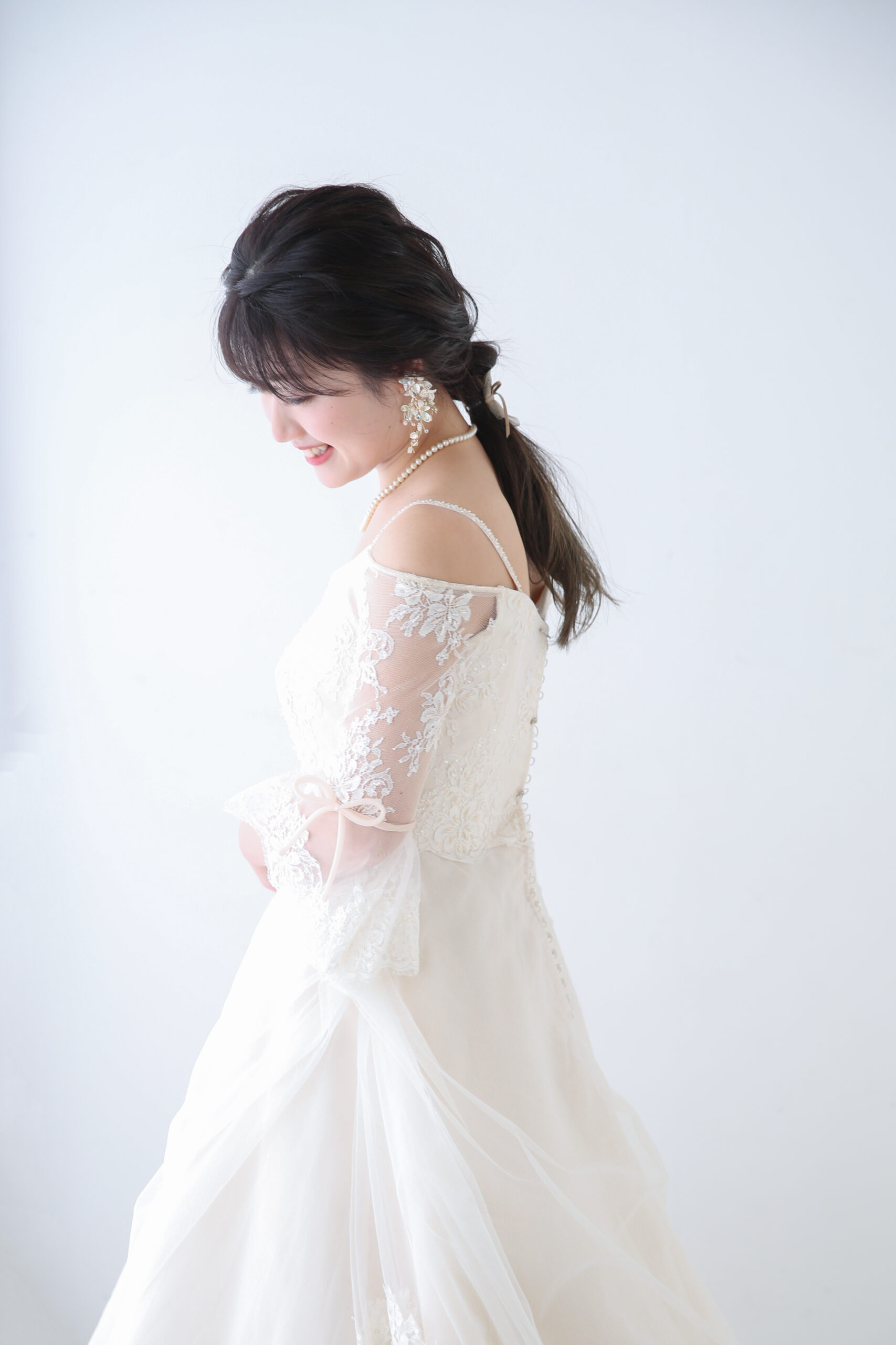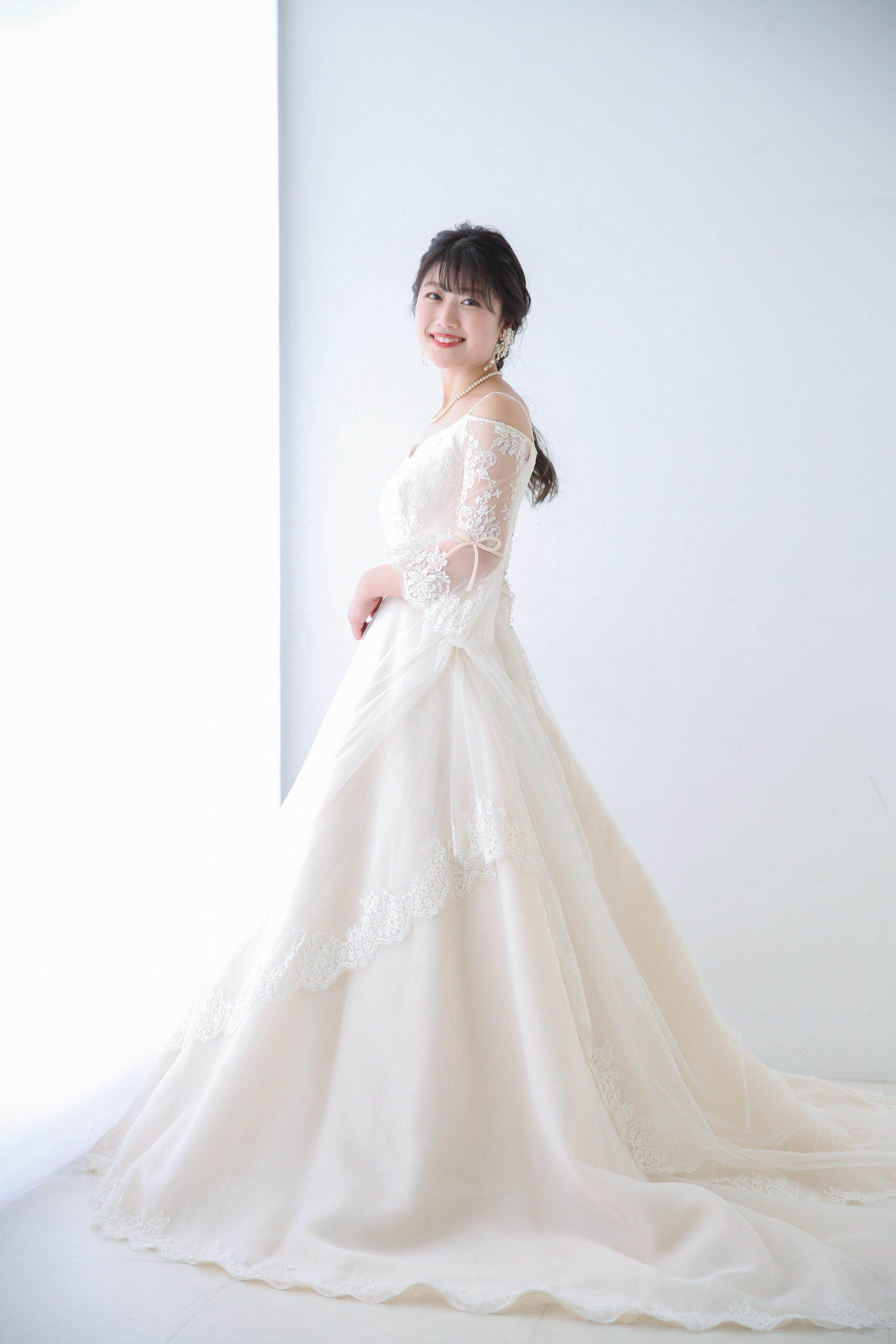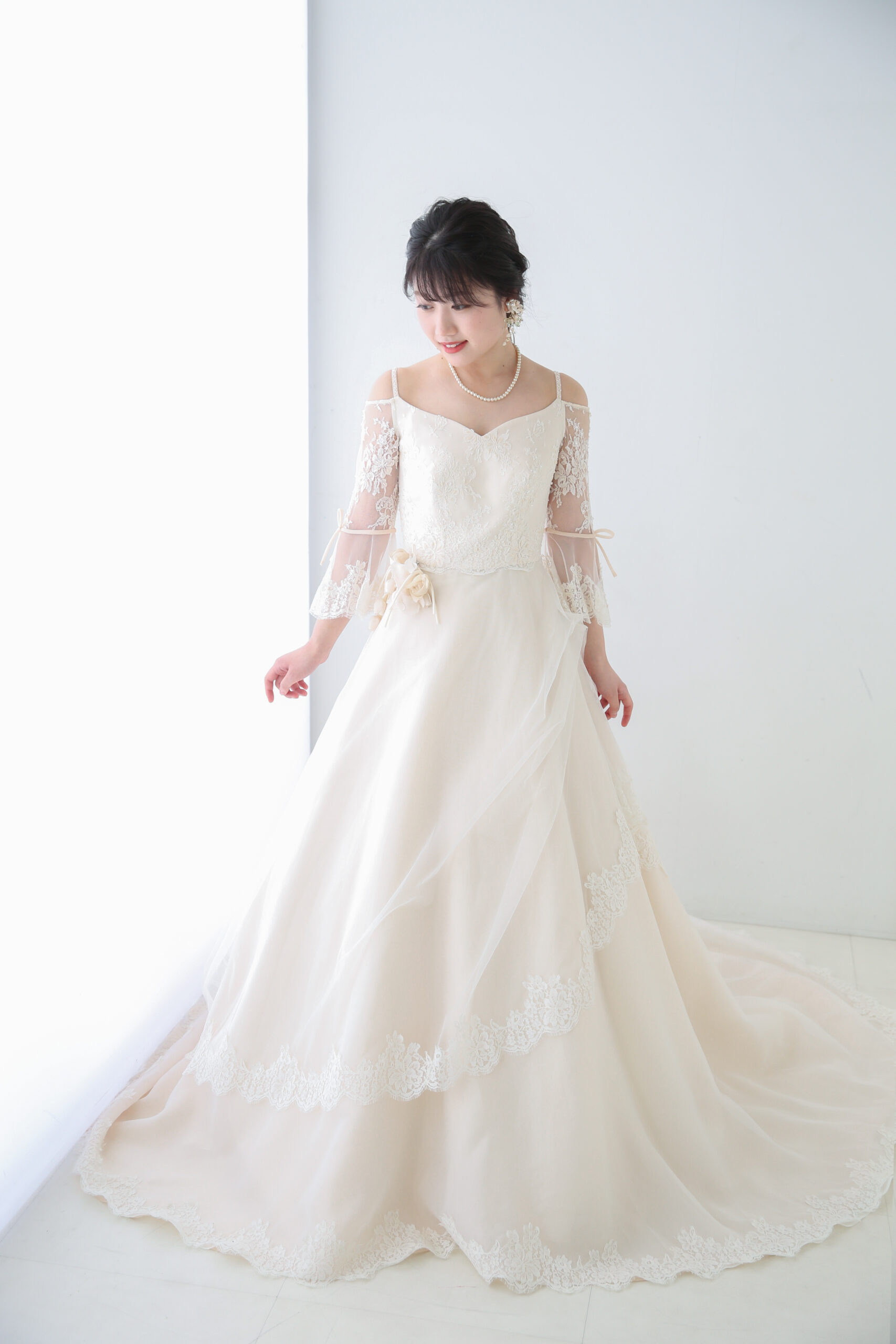 透け感のある長袖のフレアスリーブが可愛らしさを引き立てるAラインドレス。肌なじみの良いピンクベージュの色味でナチュラルな花嫁様に仕上げてくれます。