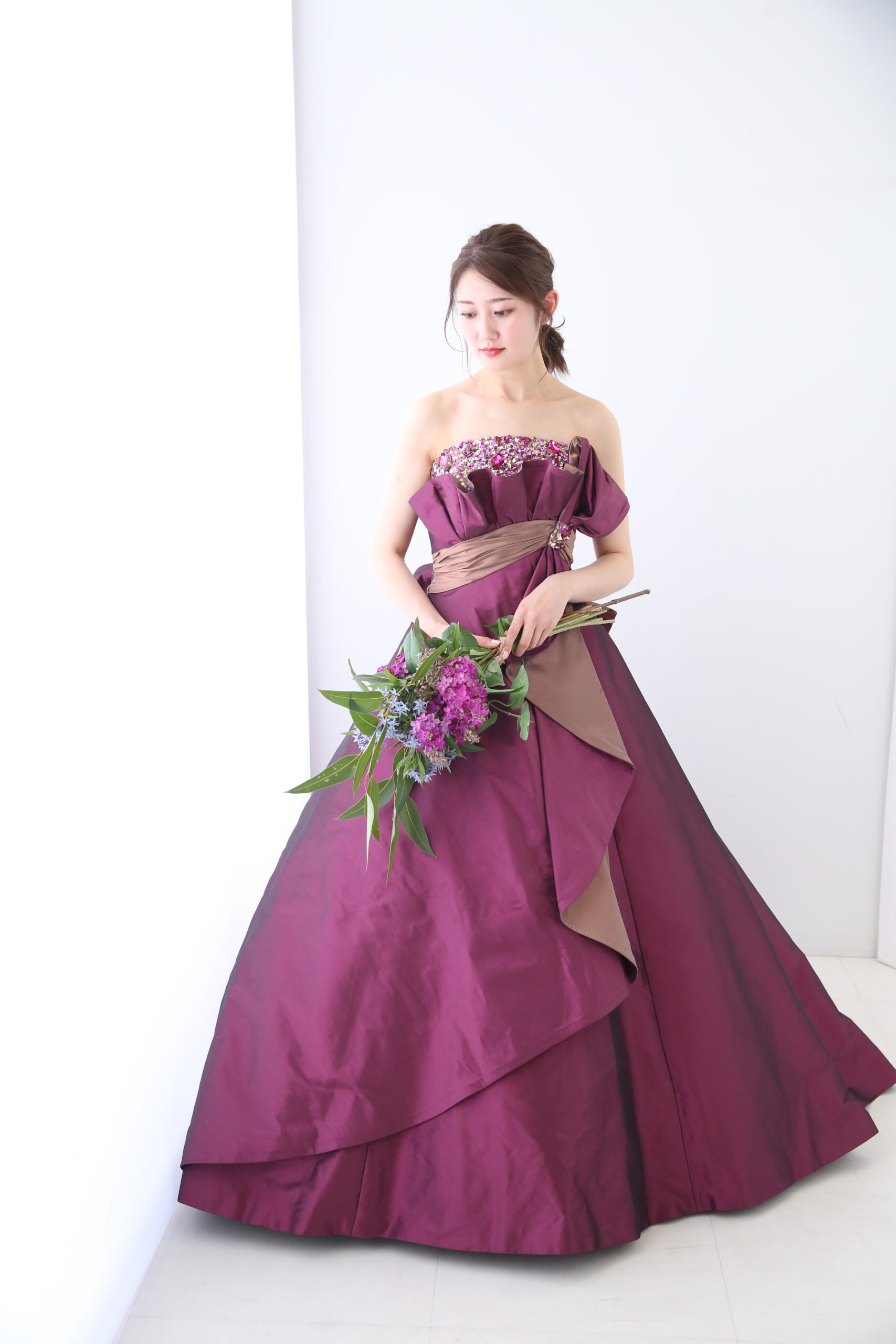 ロイヤルパープルとゴールドのコントラストが上品なサテンAラインドレス。胸元に散りばめられた宝石のようなビジューデザインが輝きます。付け外し可能なシフォントレーンで2Wayに。