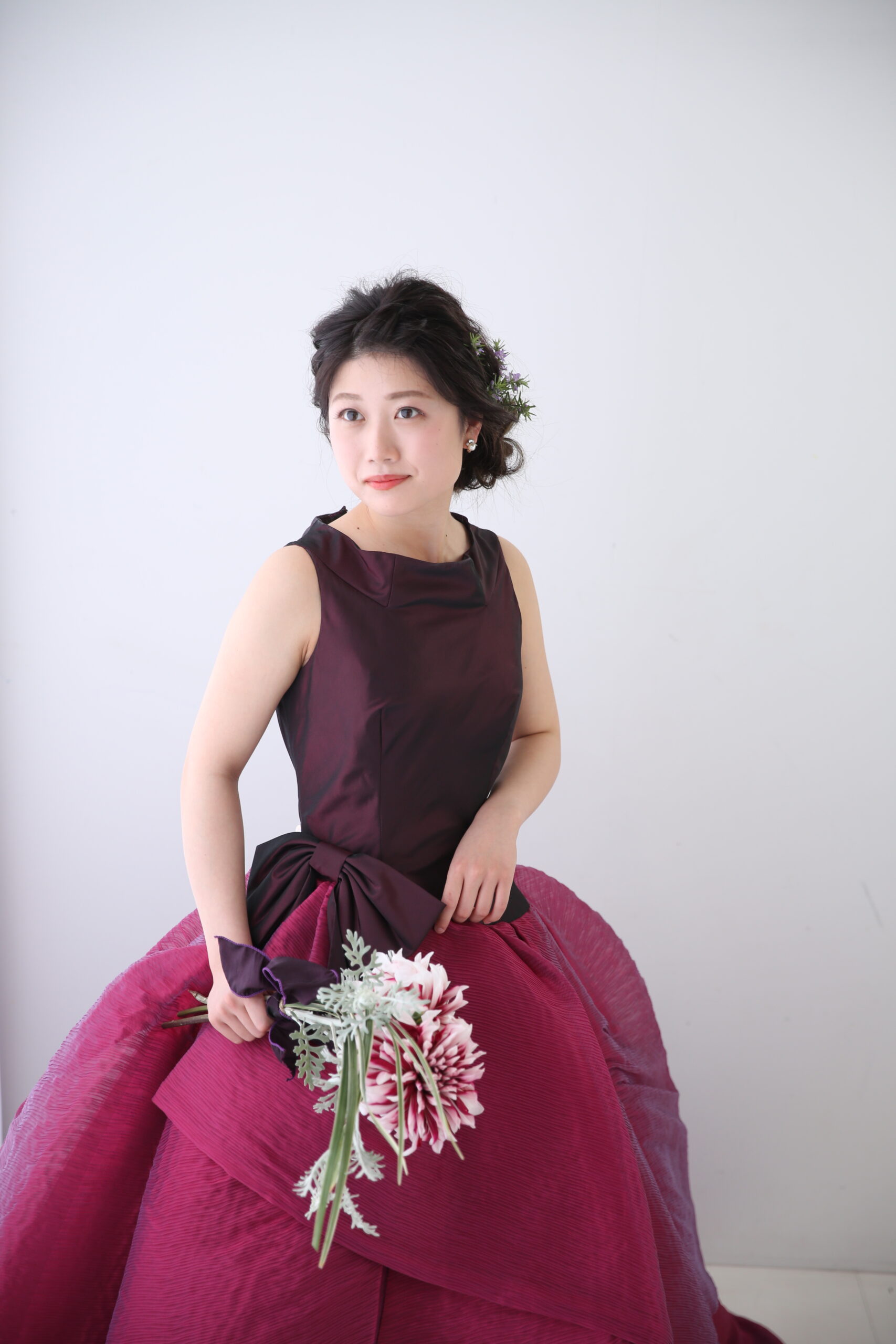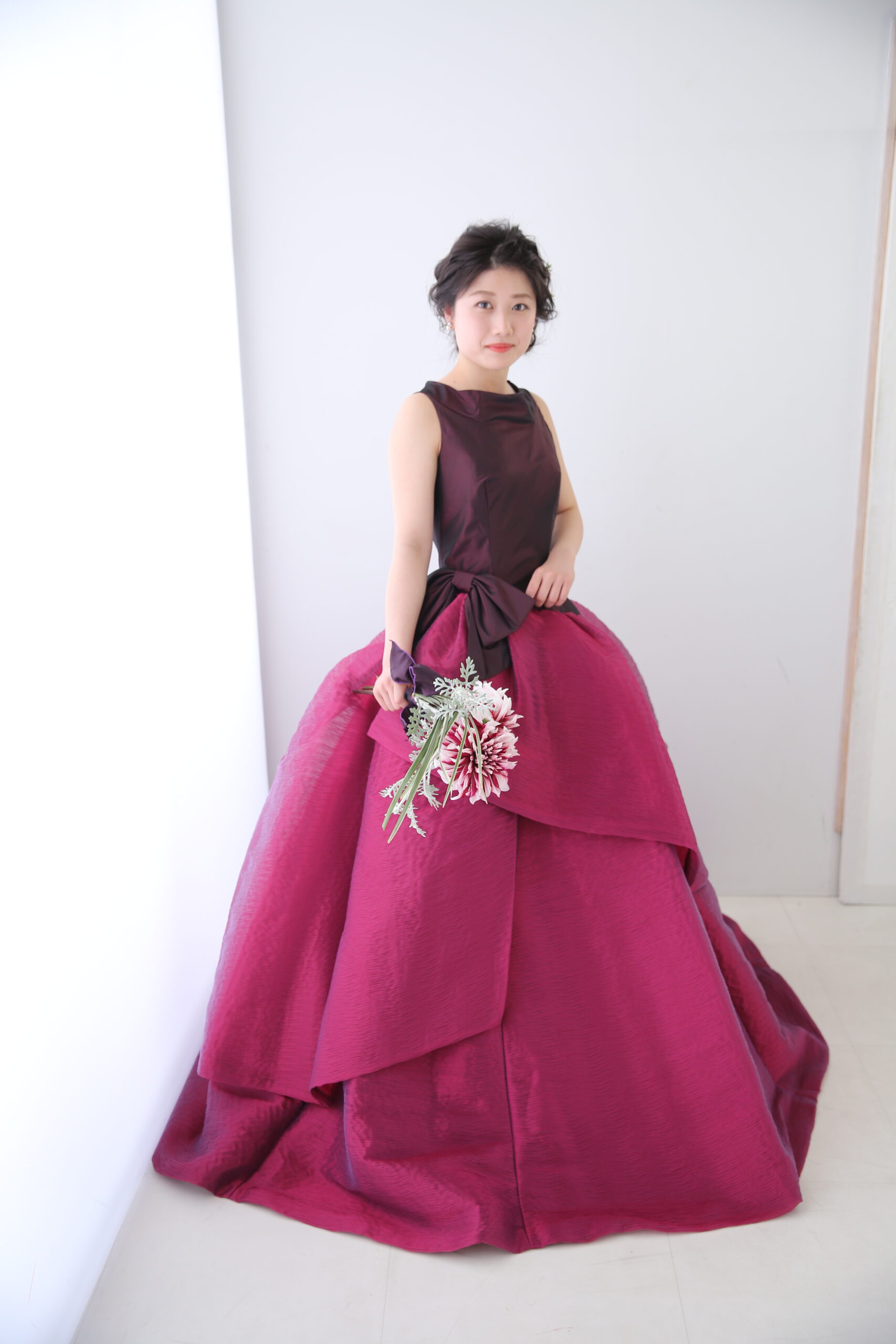 腰元からフワッと広がるデザインが特徴的なノースリーブドレス。上下同系色のパープルでまとめられたバイカラーで大人可愛い印象に。