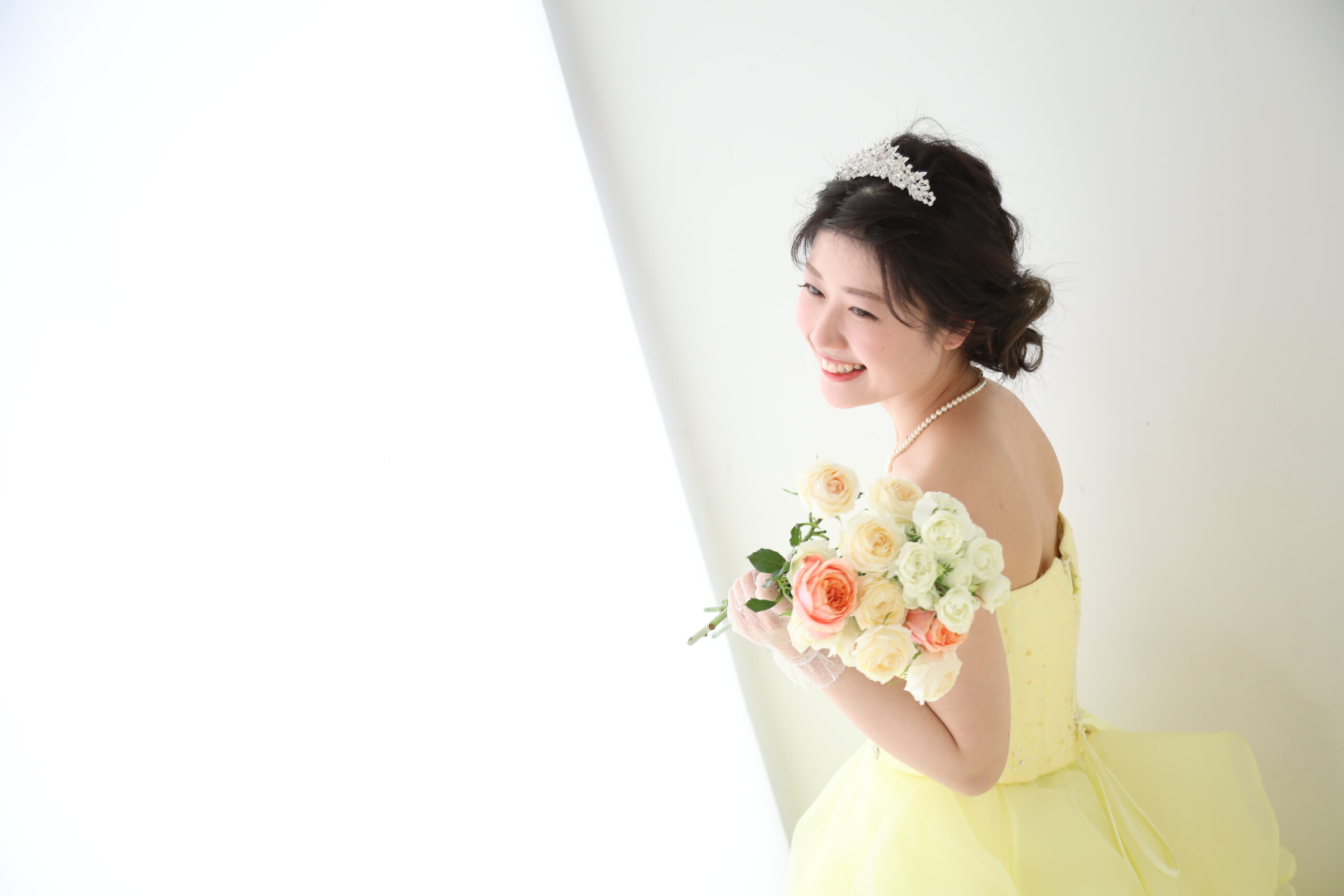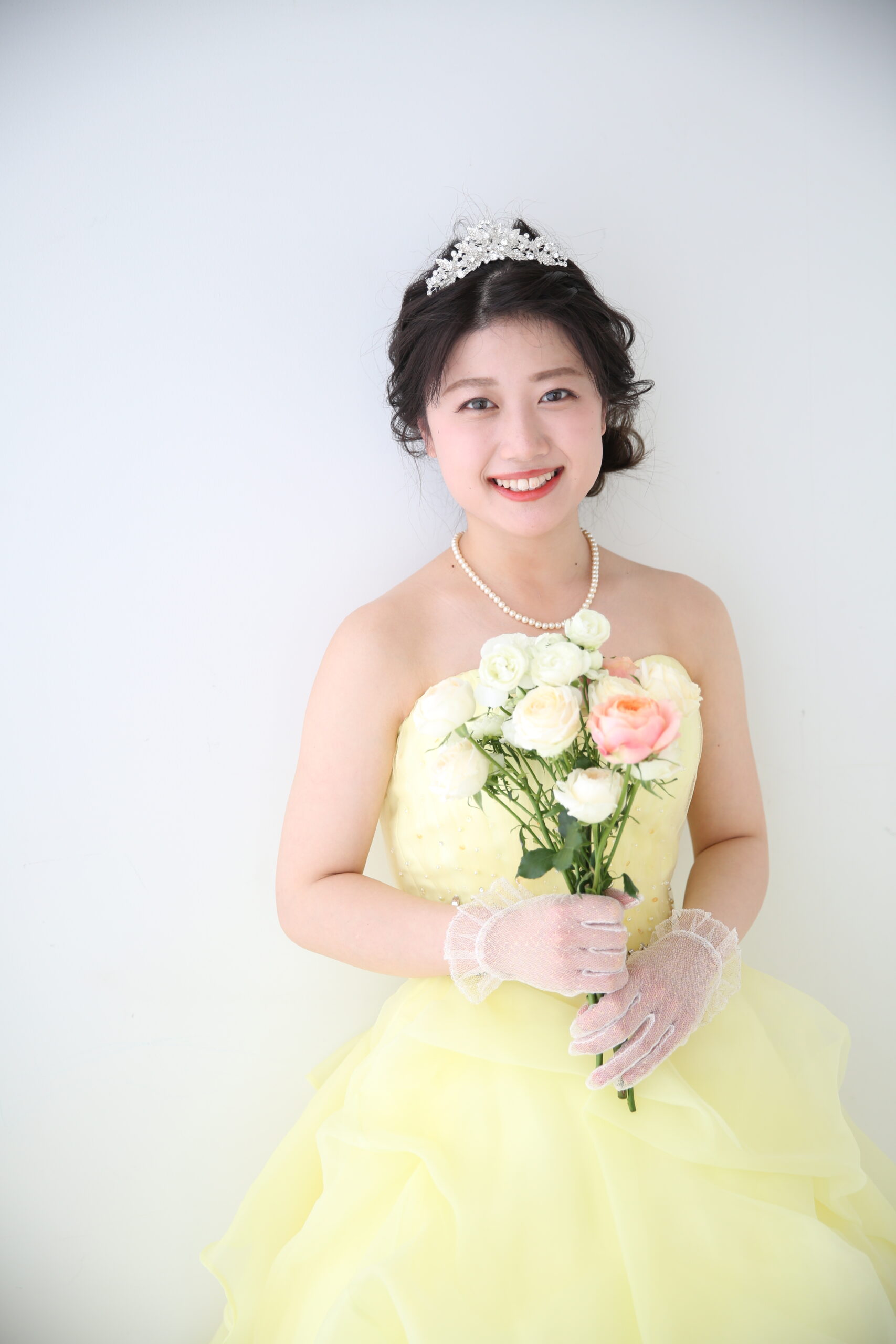 シフォン生地でふんわりとしたドレス。淡いパステルイエローで元気で明るい印象になります。ウェストのビジューがアクセントに。