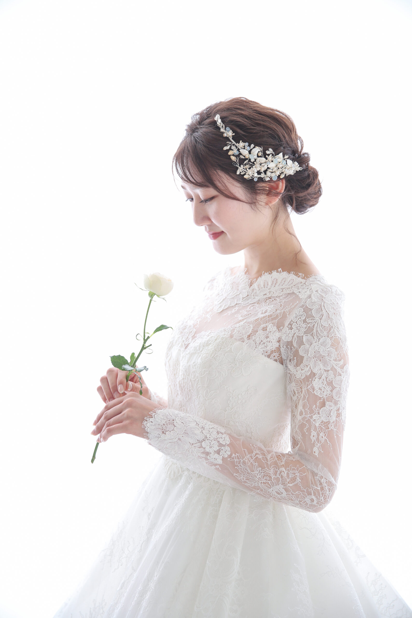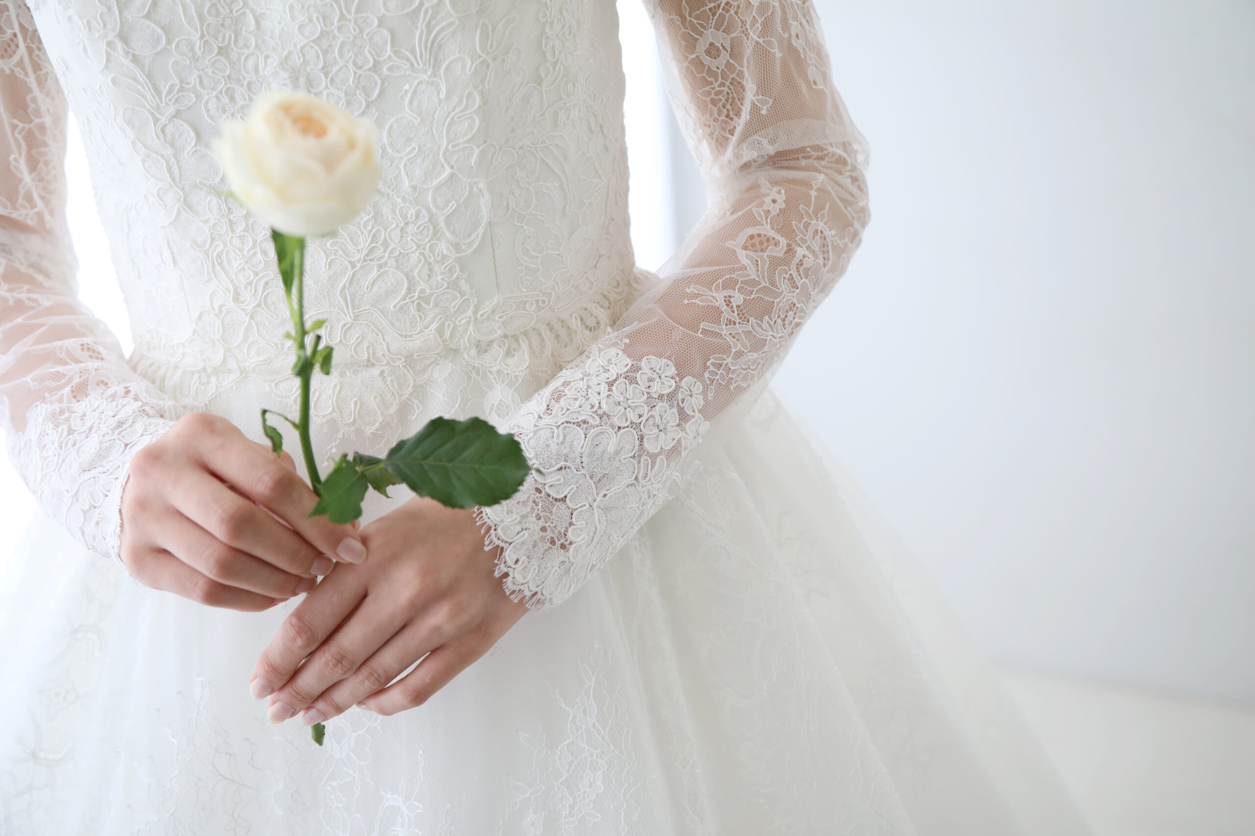 透け感のある長袖デザインで女性らしいエレガントな印象に。全体に施されたレースで上品な大人花嫁様を演出します。