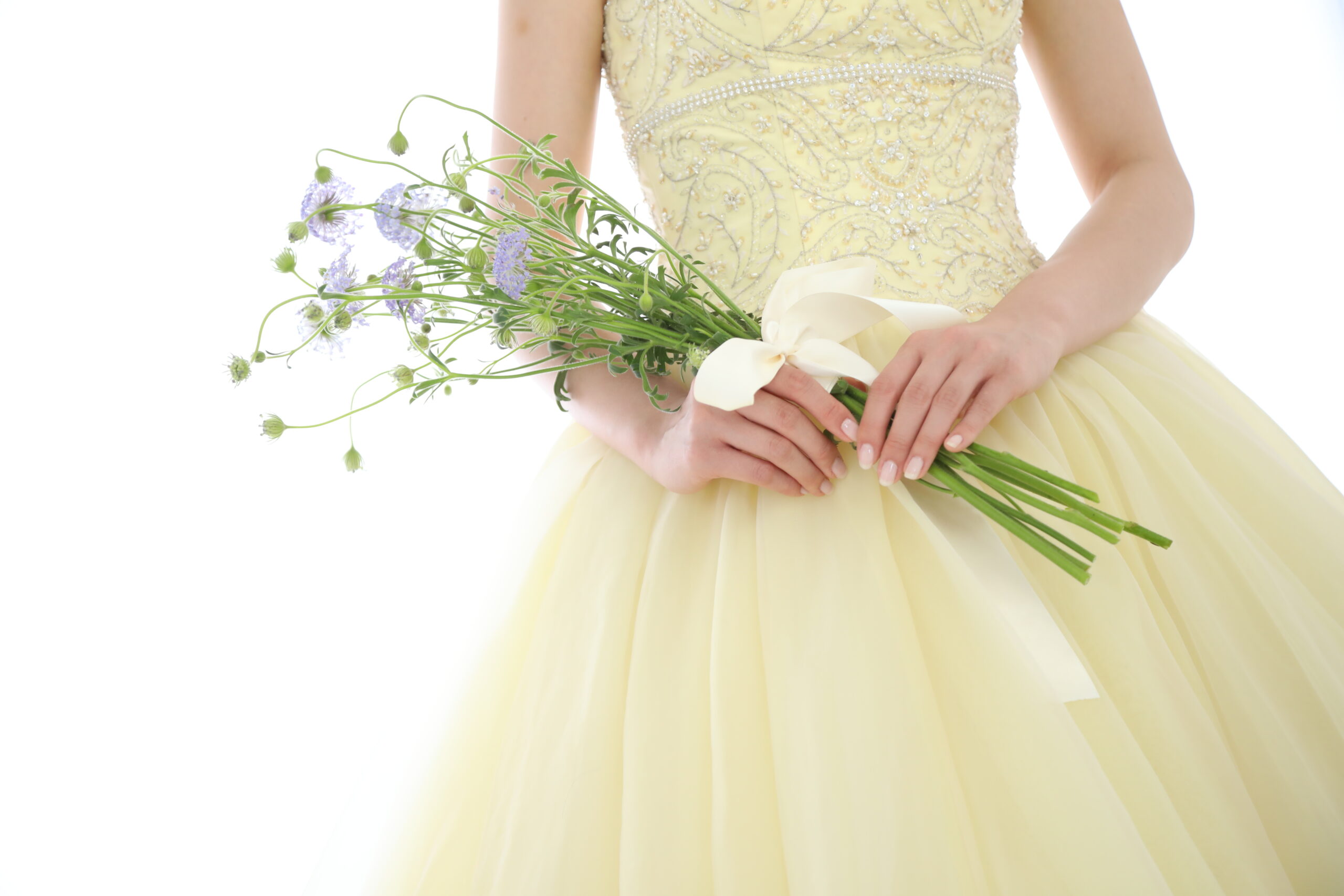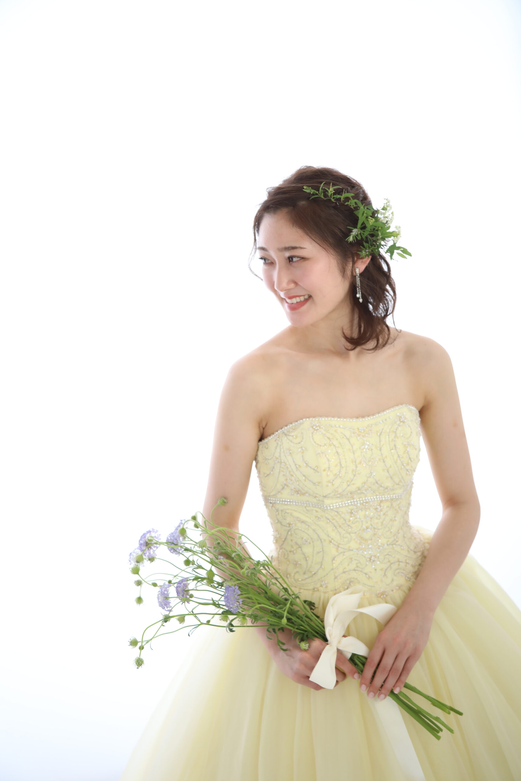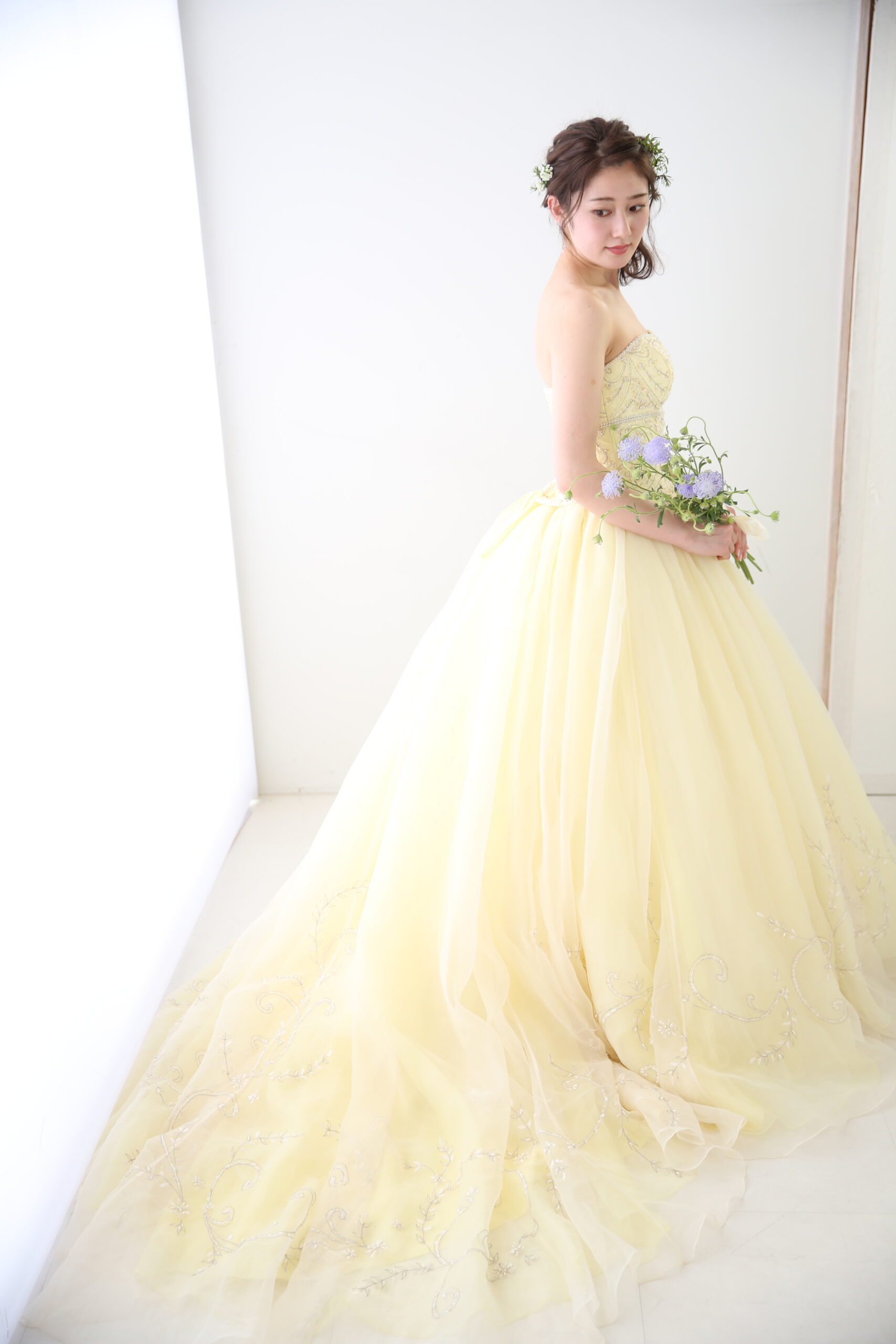 ペールイエローのシフォンドレス。シンプルでナチュラルにカワイイを作り出すプリンセスラインのドレスです。