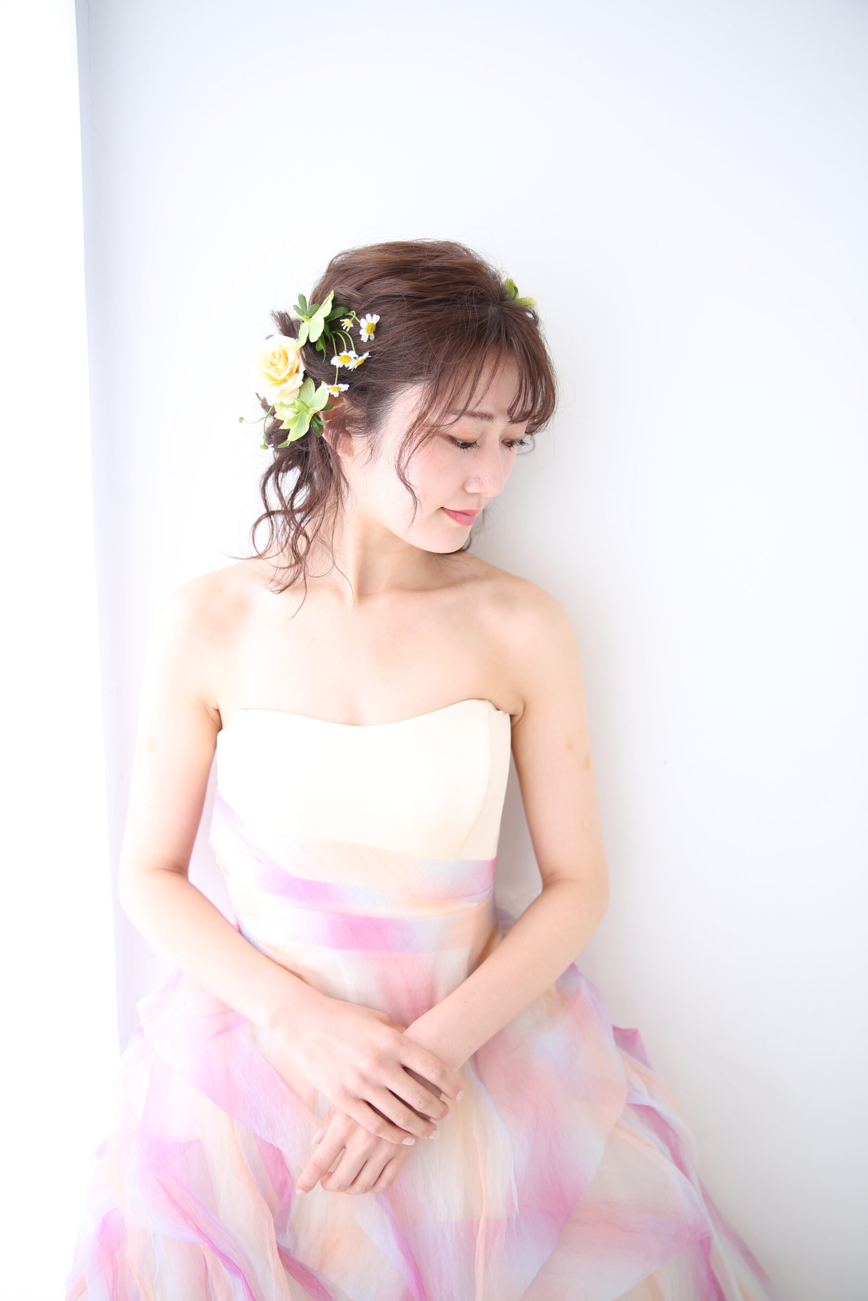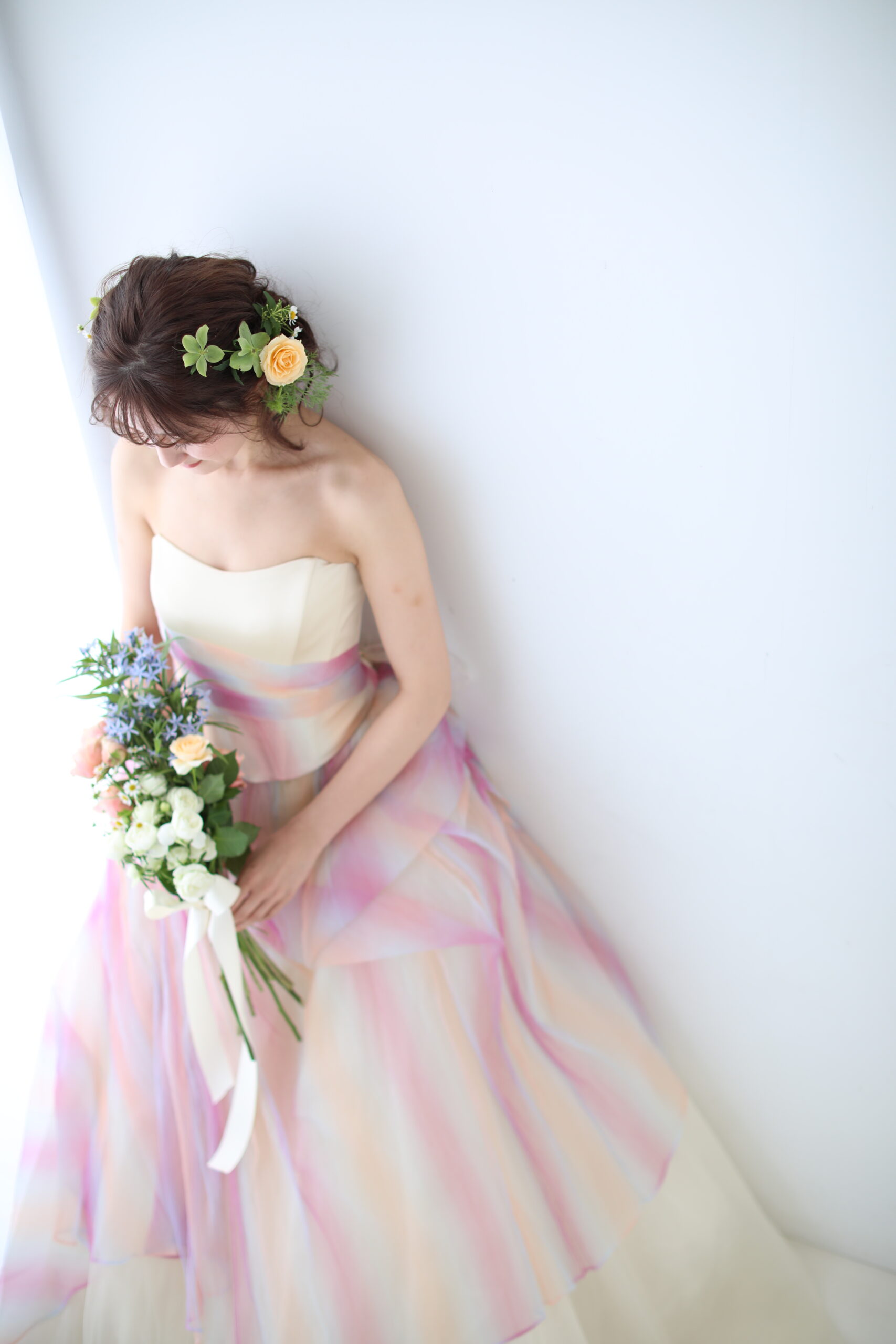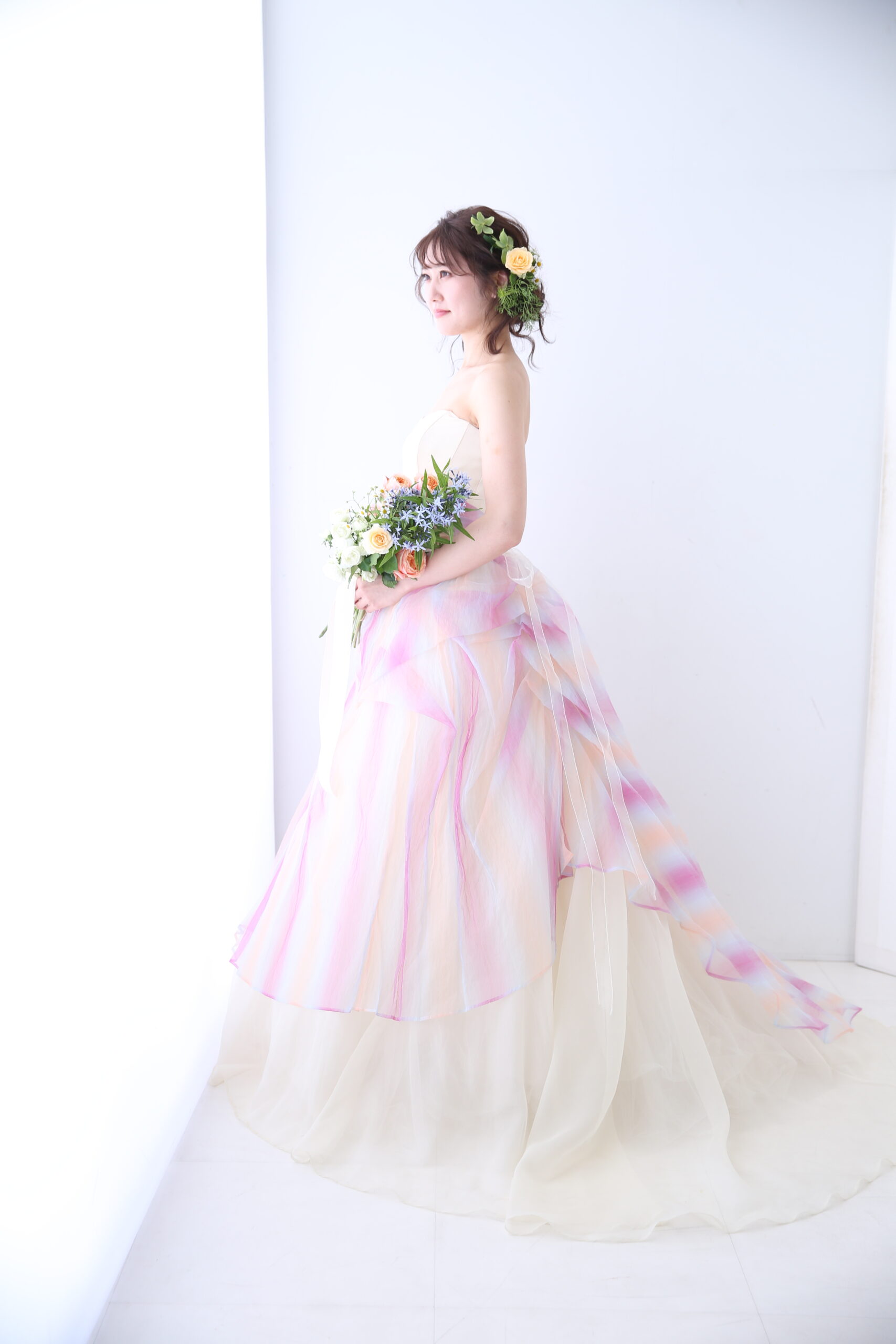 シフォンの柔らかな雰囲気のドレス。オフホワイトベースでナチュラルなレインボーカラーのデザインがさりげなく女性らしさをプラスしてくれます。