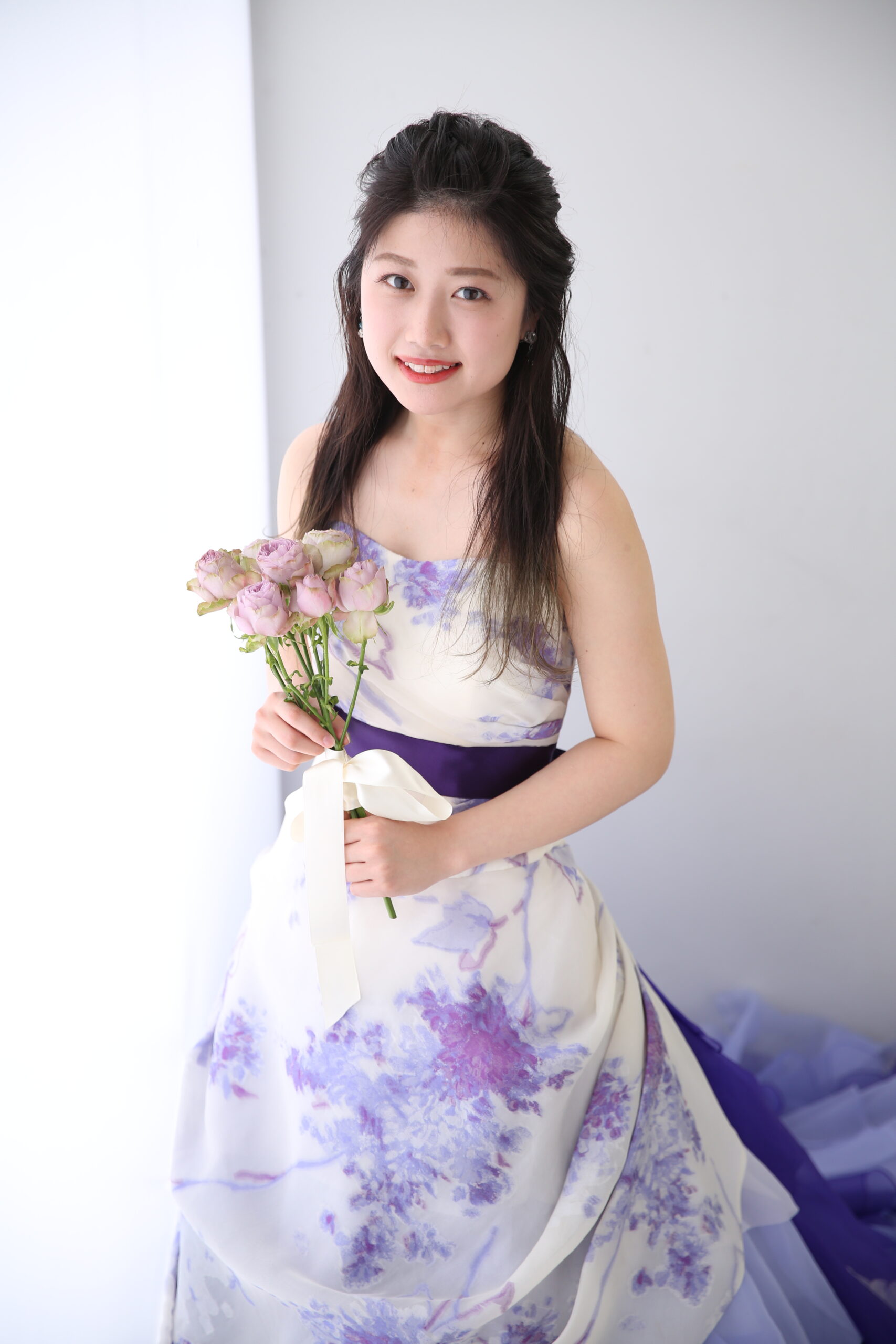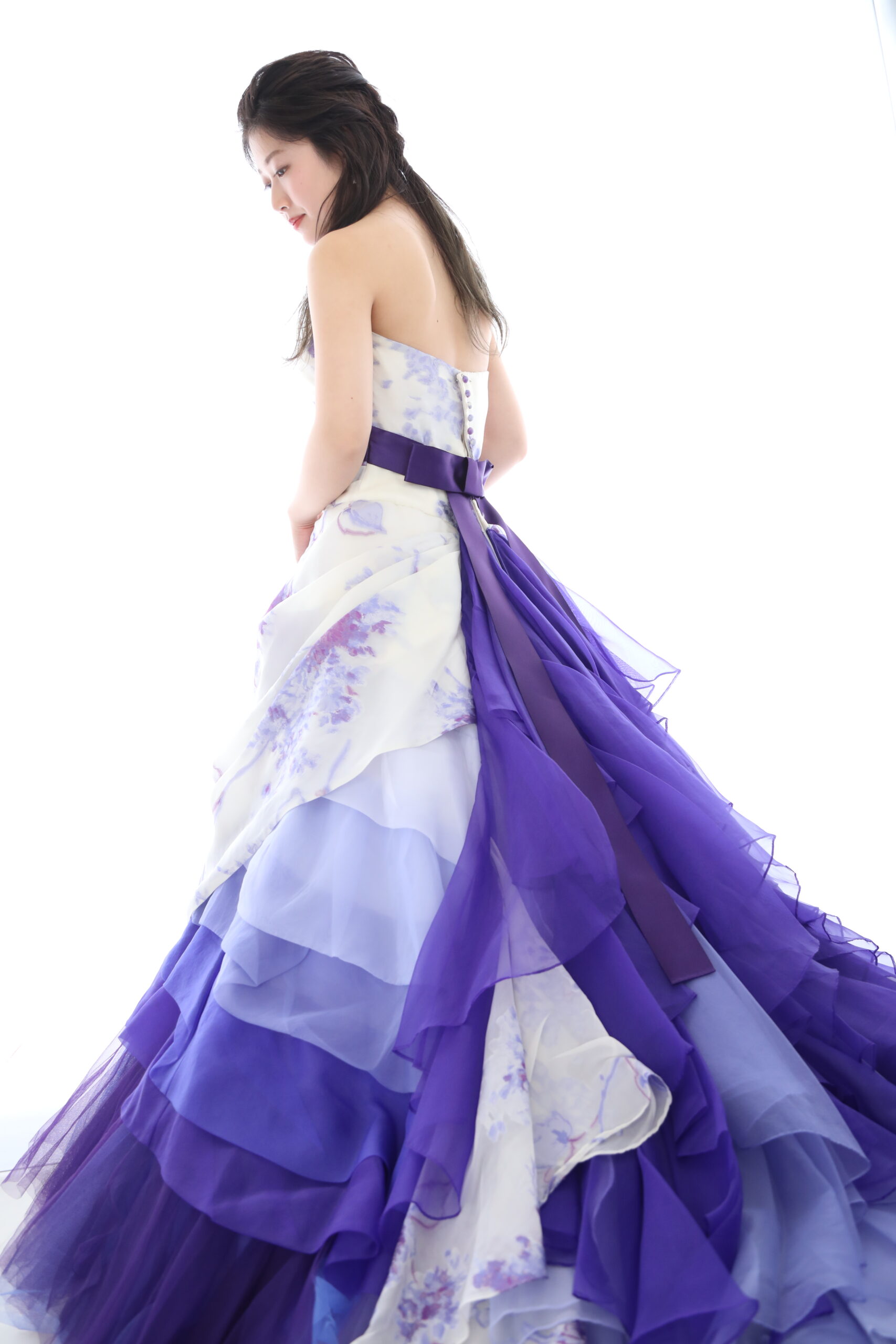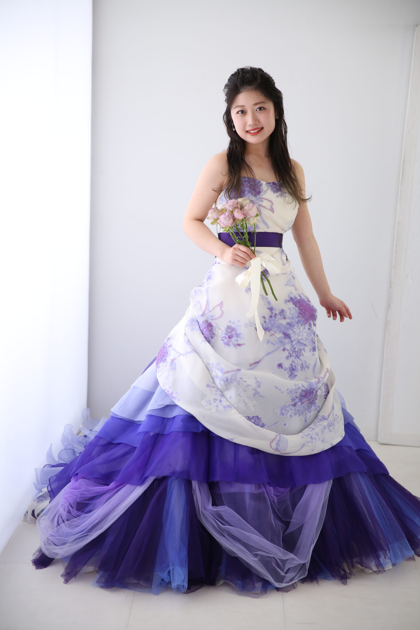 ホワイトベースのシフォン生地にパープルのフラワーデザインが施されたドレス。白から濃い紫のグラデーションが大人カワイイを演出します。