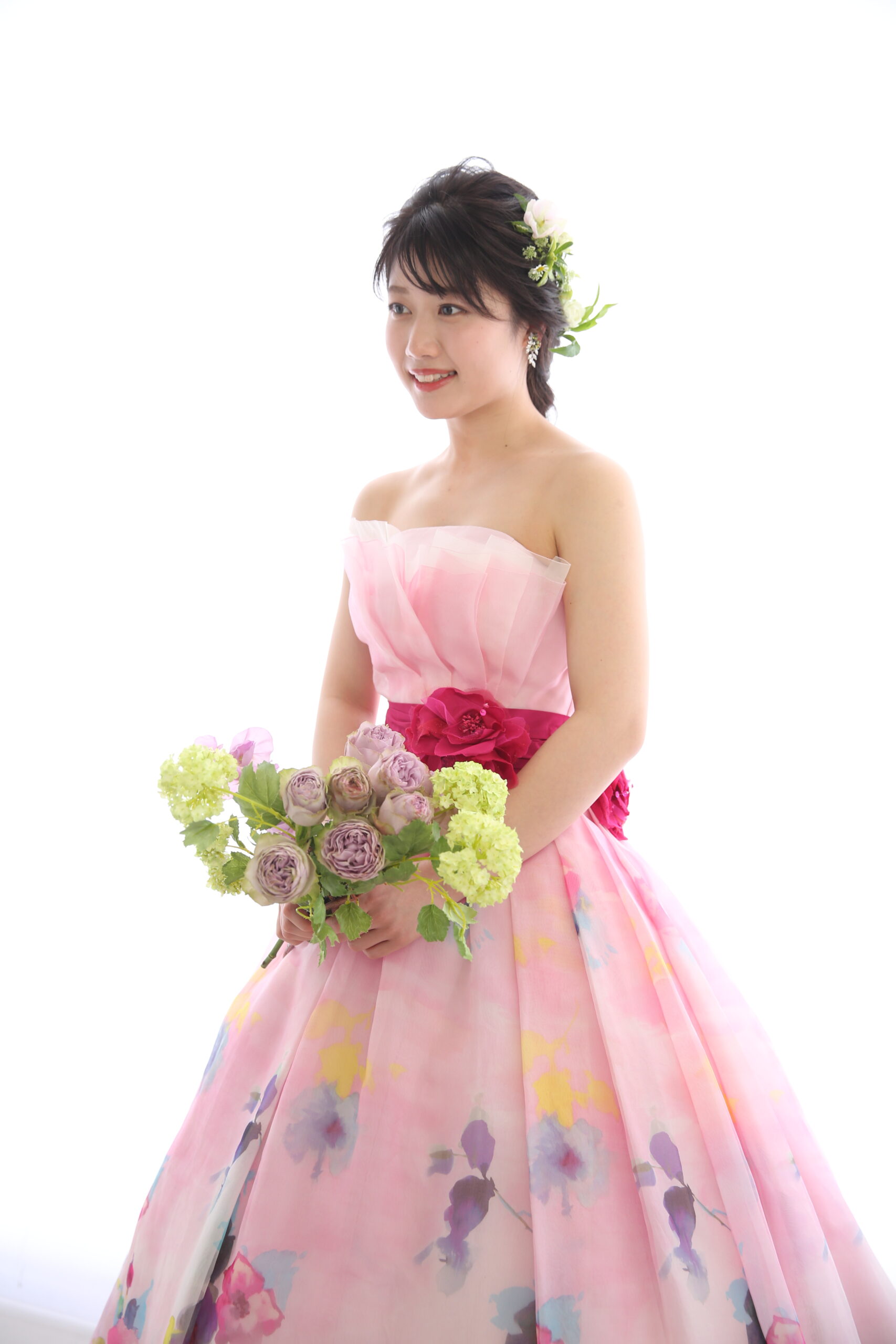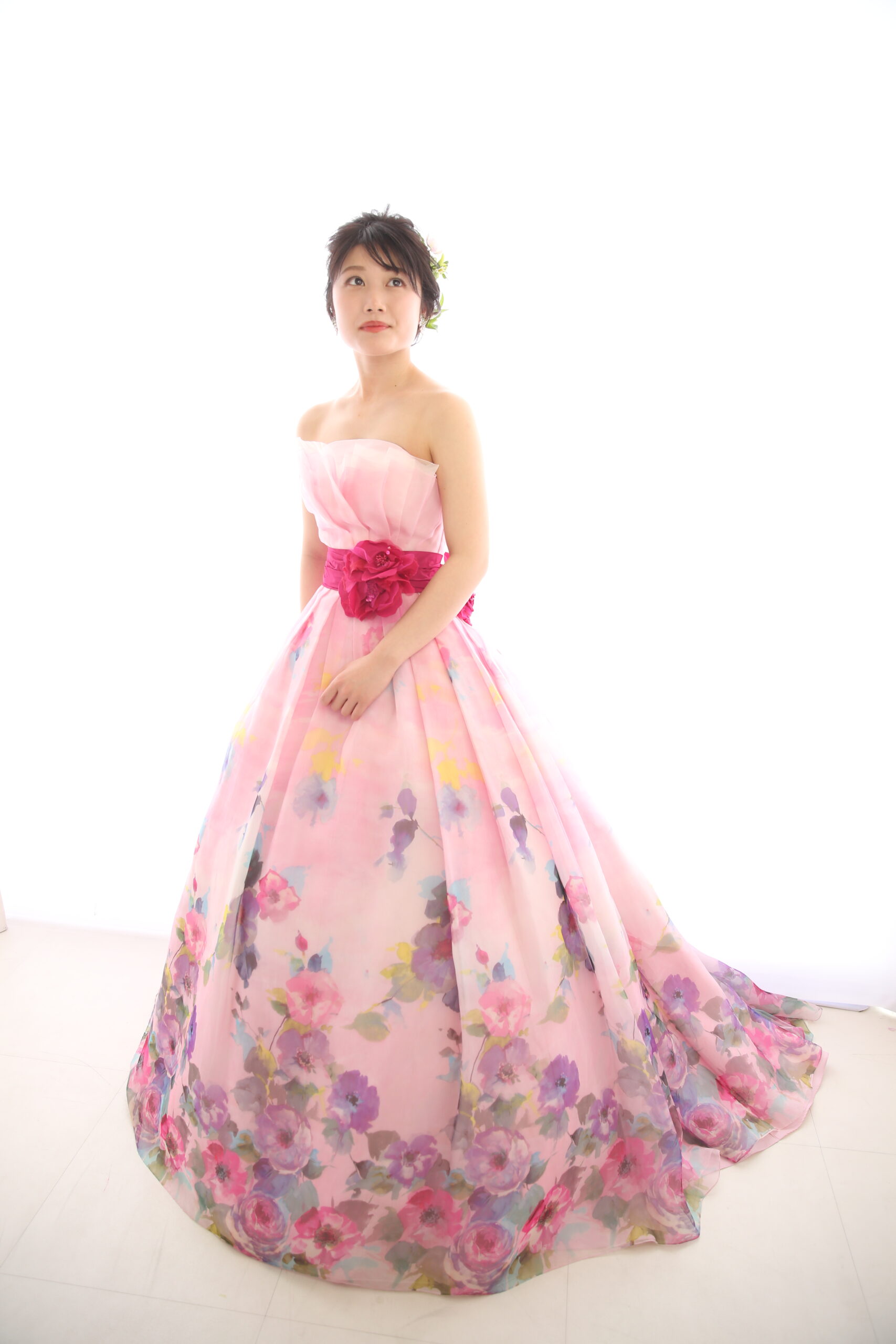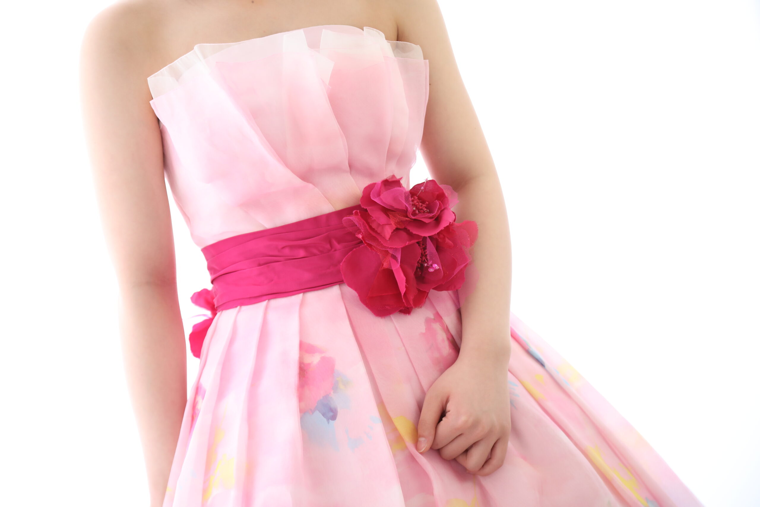 淡いピンク色のシフォン生地。花柄のプリントがカラフルでカワイイく、ウエストの赤いリボンがアクセントになります。
