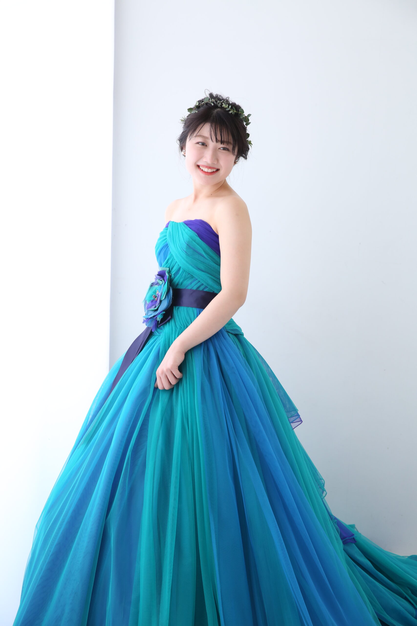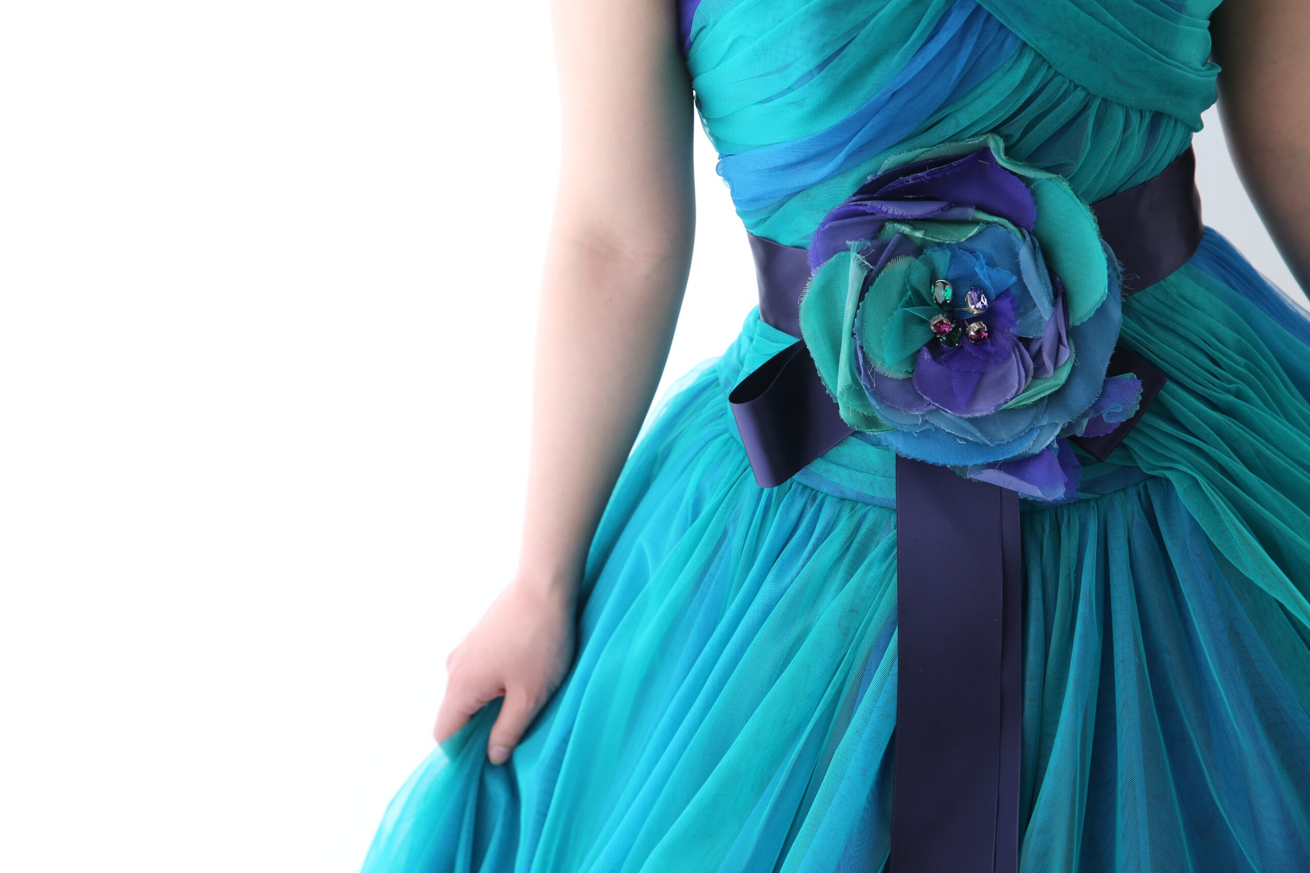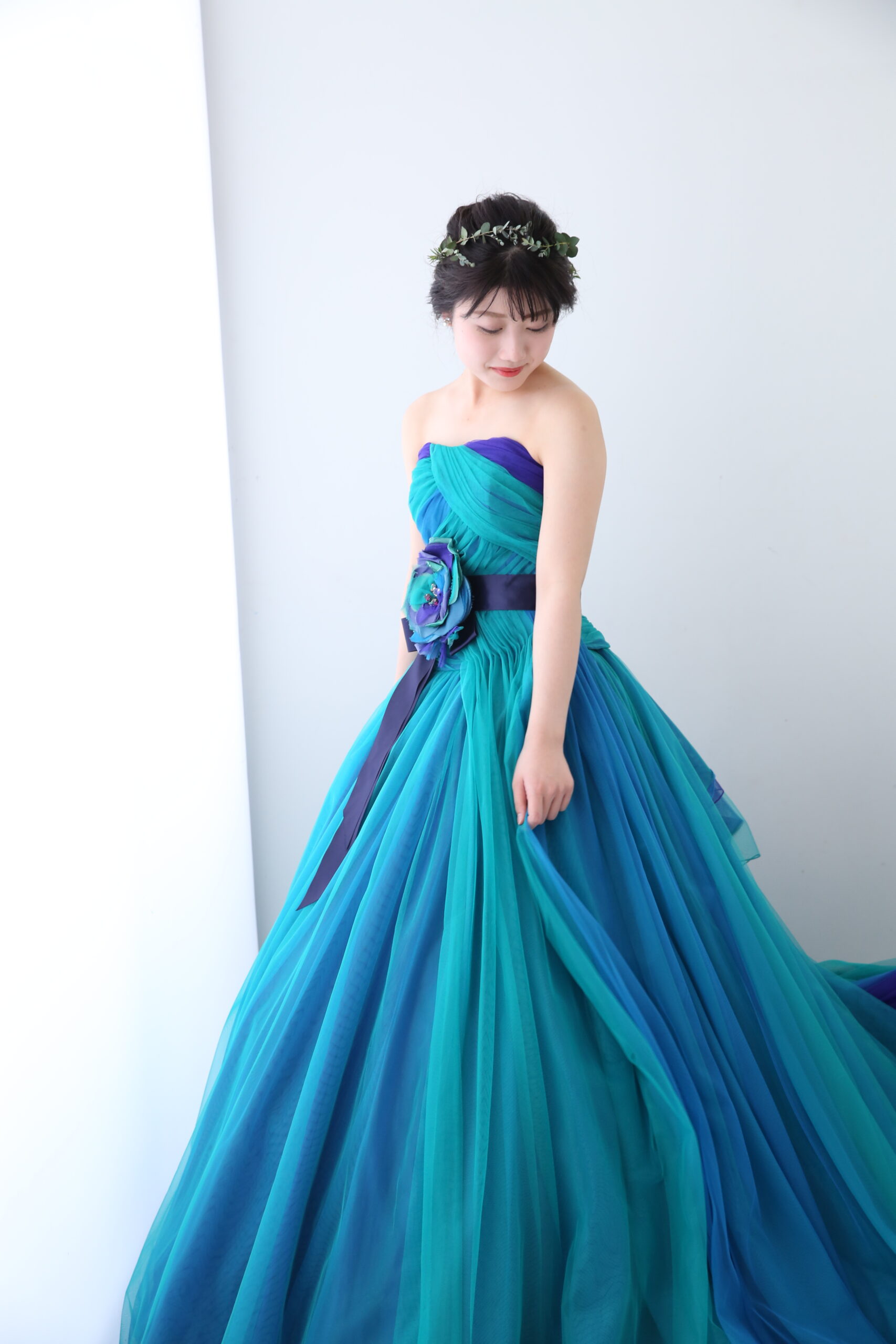 鮮やかなターコイズブルーのプリンセスラインドレス。グラデーションのデザインで立体感があります。ウエストのモチーフがアクセントに。