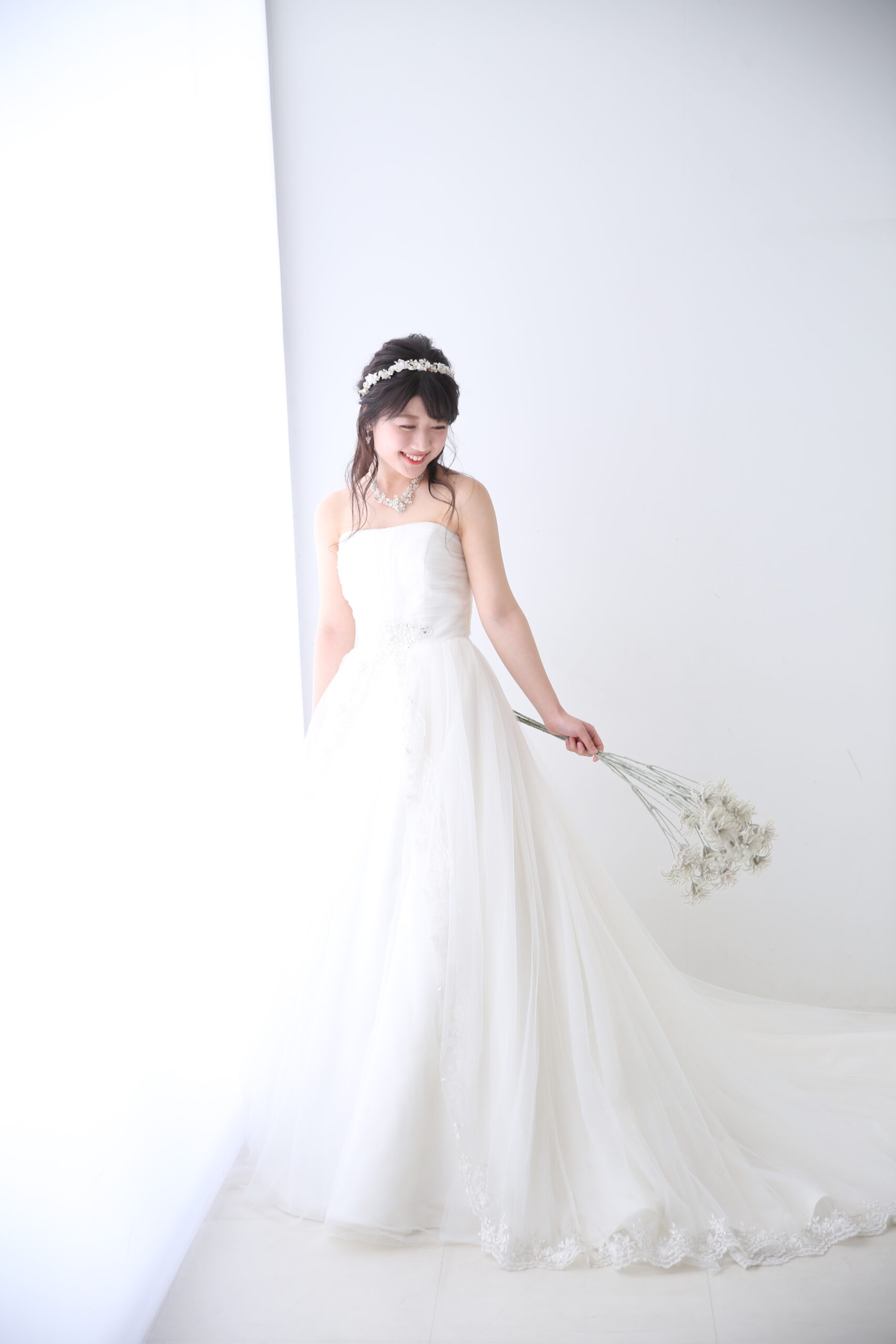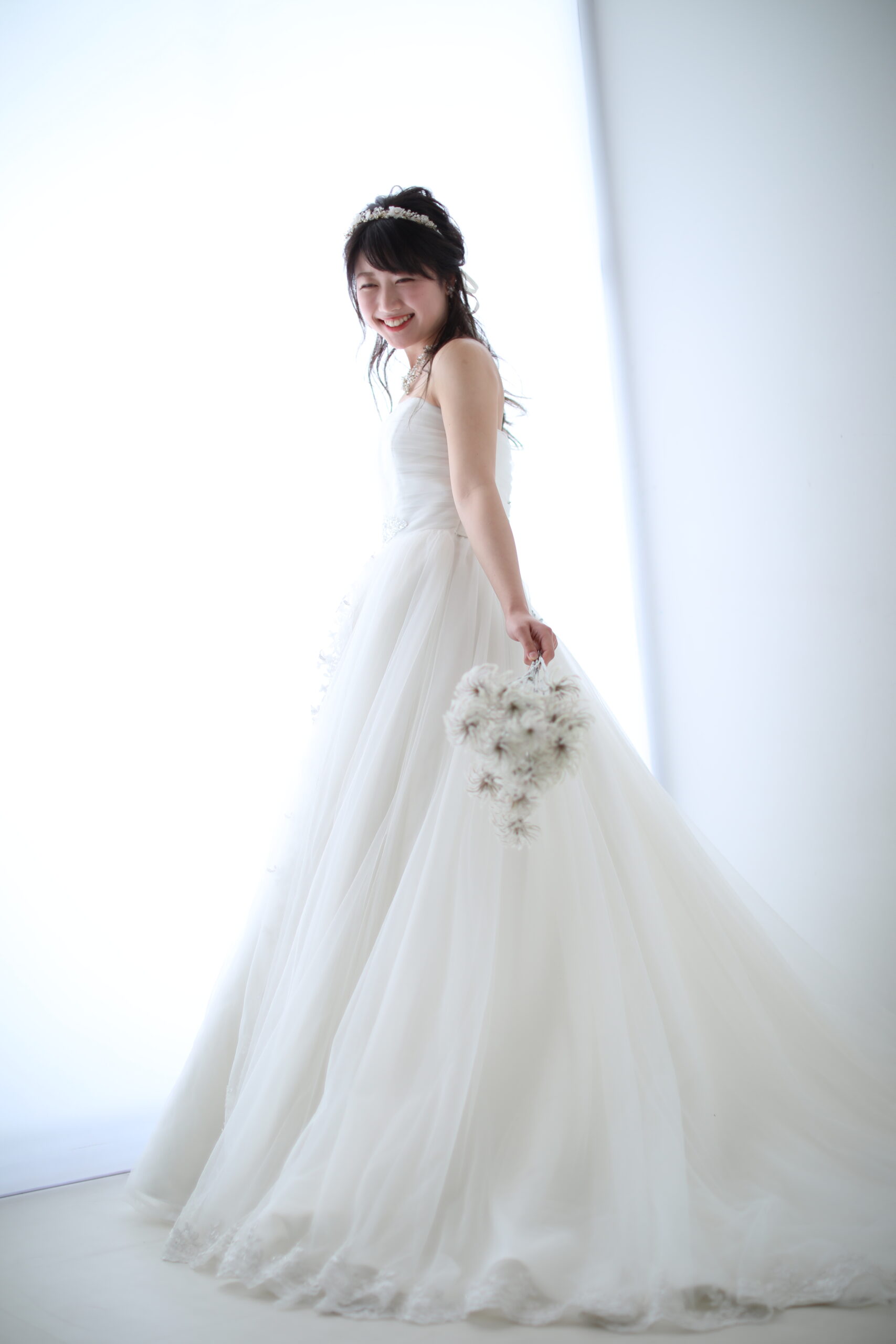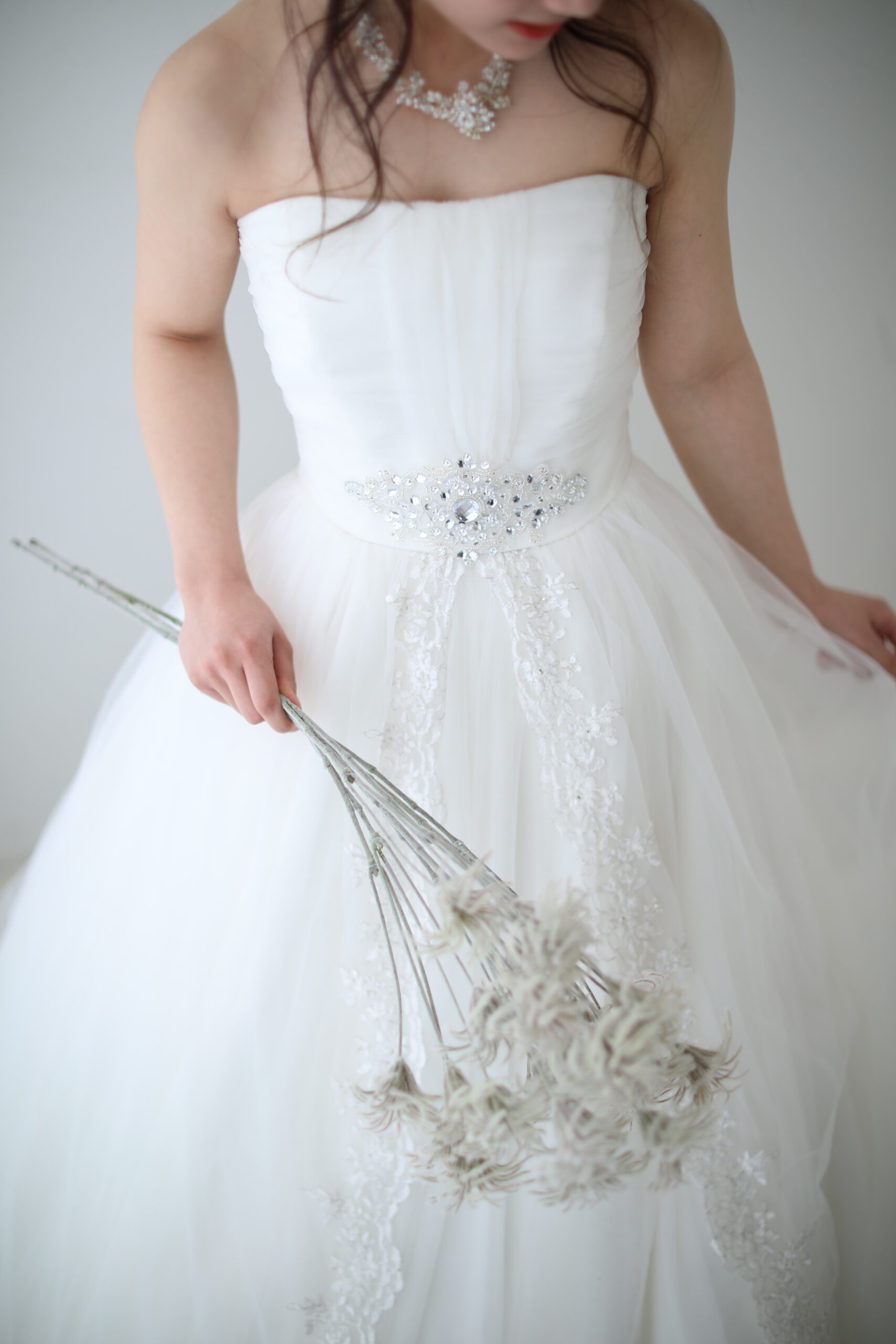 チュール生地でふんわり柔らかな印象の真っ白なドレス。ウエストのビジューがアクセントとなり全体を引き締めてくれます。