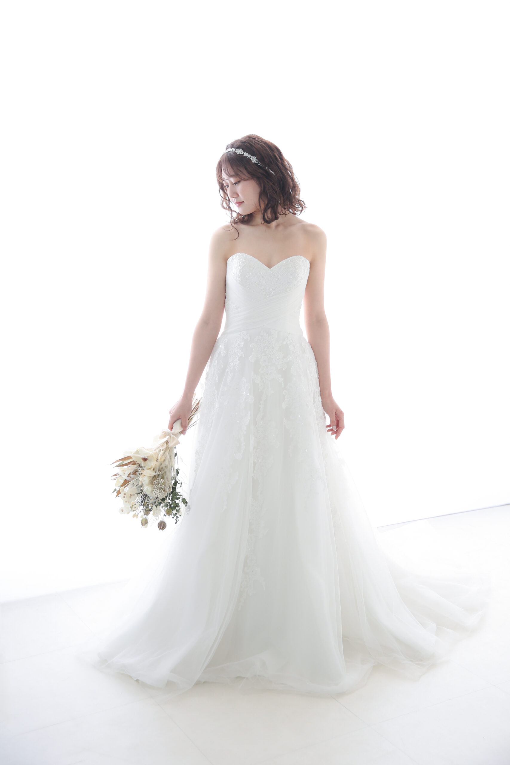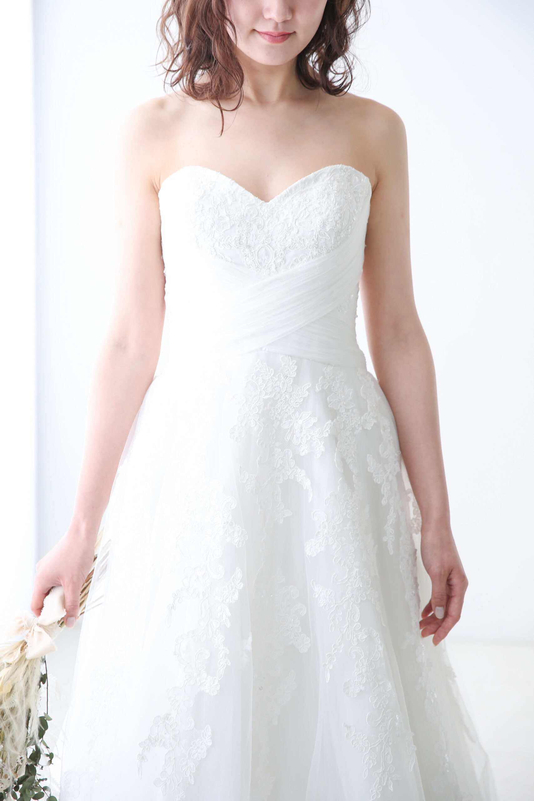 柔らかいチュール生地の真っ白なドレス。ハートカットで胸元を美しく、ウェストのクロスされたデザインでスタイル良く見せてくれるスレンダーラインの衣装です。